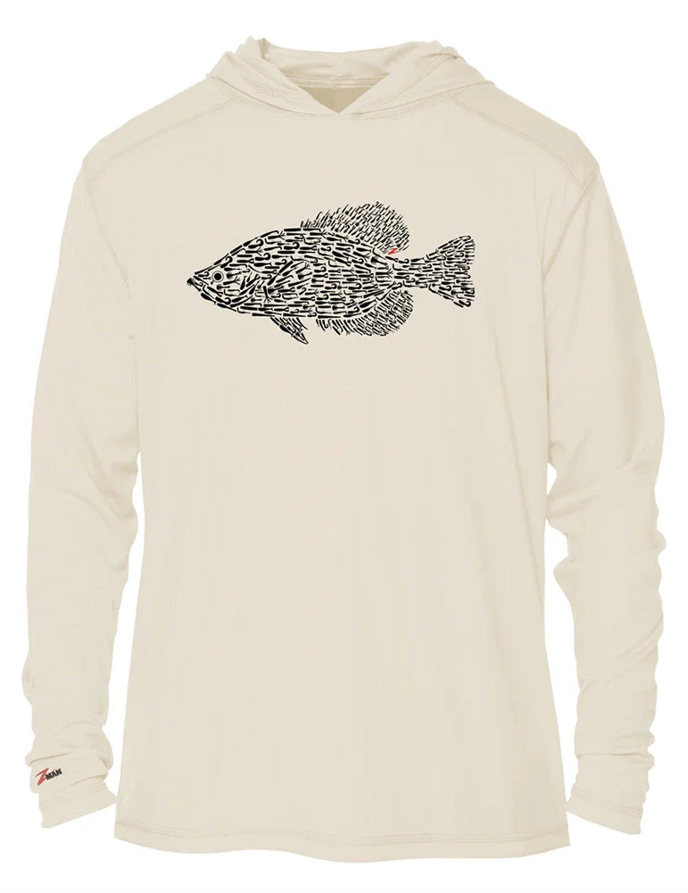 - The light tan hoodie features a fully sublimated front center chest with the Crappie BaitZ design for maximum comfort, with a broad hood to offer ample sun protection.