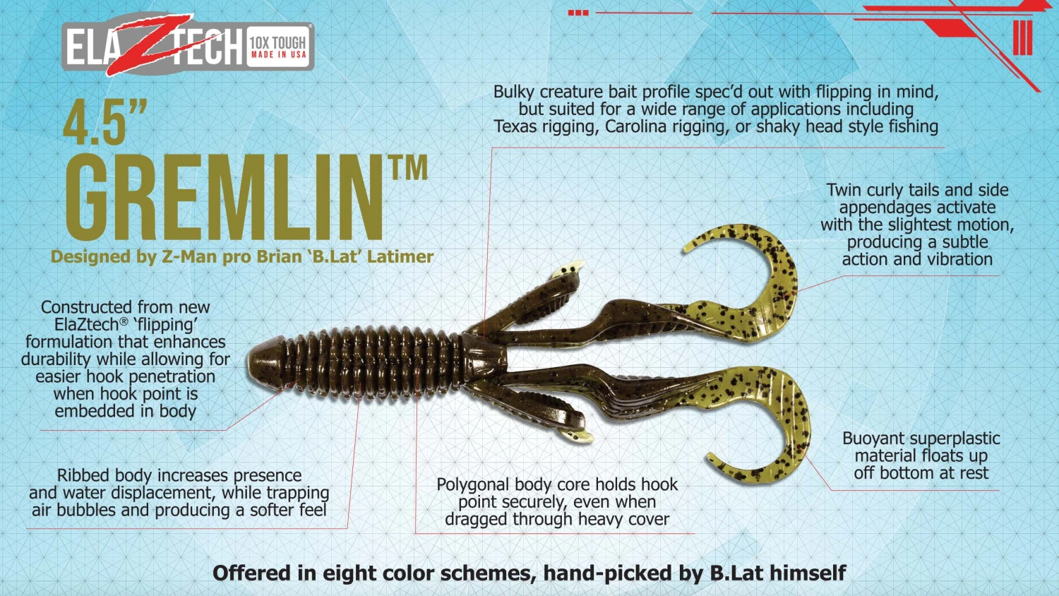 - Measuring 4.5 inches long and available in 8 hand picked Brian Latimer colors, the Z-Man Gremlin is the ultimate soft plastic for your tackle box and is sure to attract the fish cast after cast!